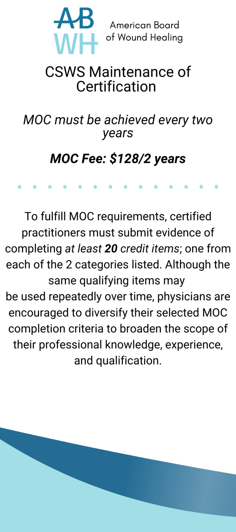 - All applicants must meet ABWH’s current Certified Skin and Wound Specialist (CSWS) re-certification requirements to maintain active status