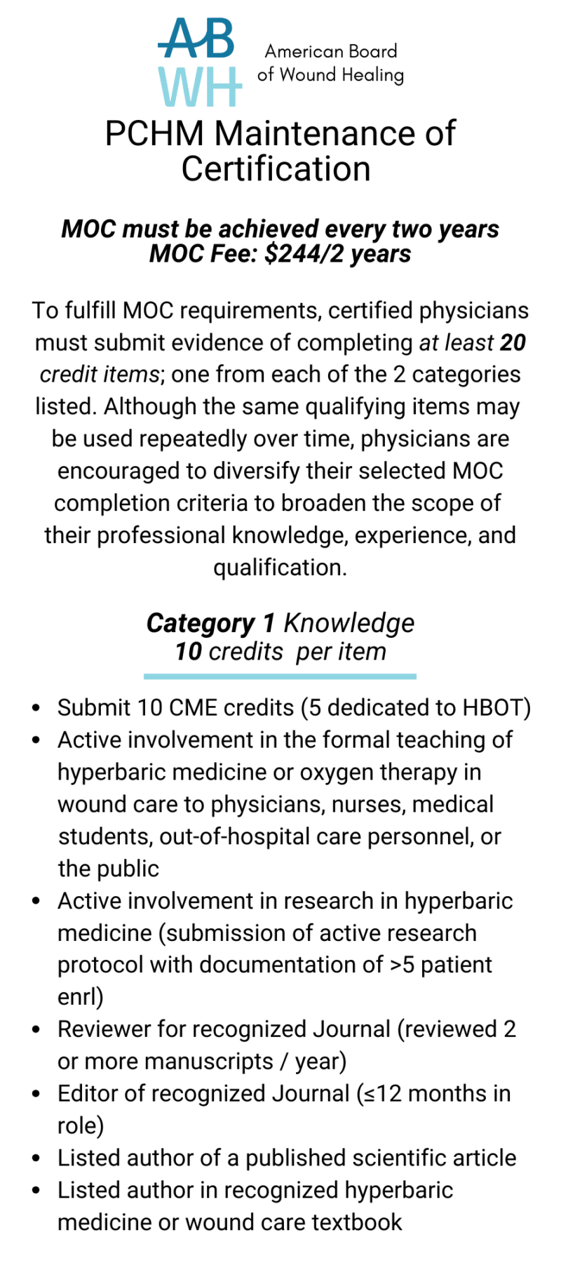 - All applicants must meet ABWH’s current Certified Hyperbaric Medicine Specialist re-certification requirements to maintain active status